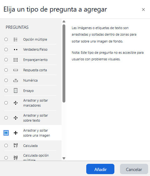 - Seleccionar la categoria y hacer clic en el botón "Crear una nueva pregunta", se mostrará una lista de tipos de preguntas.