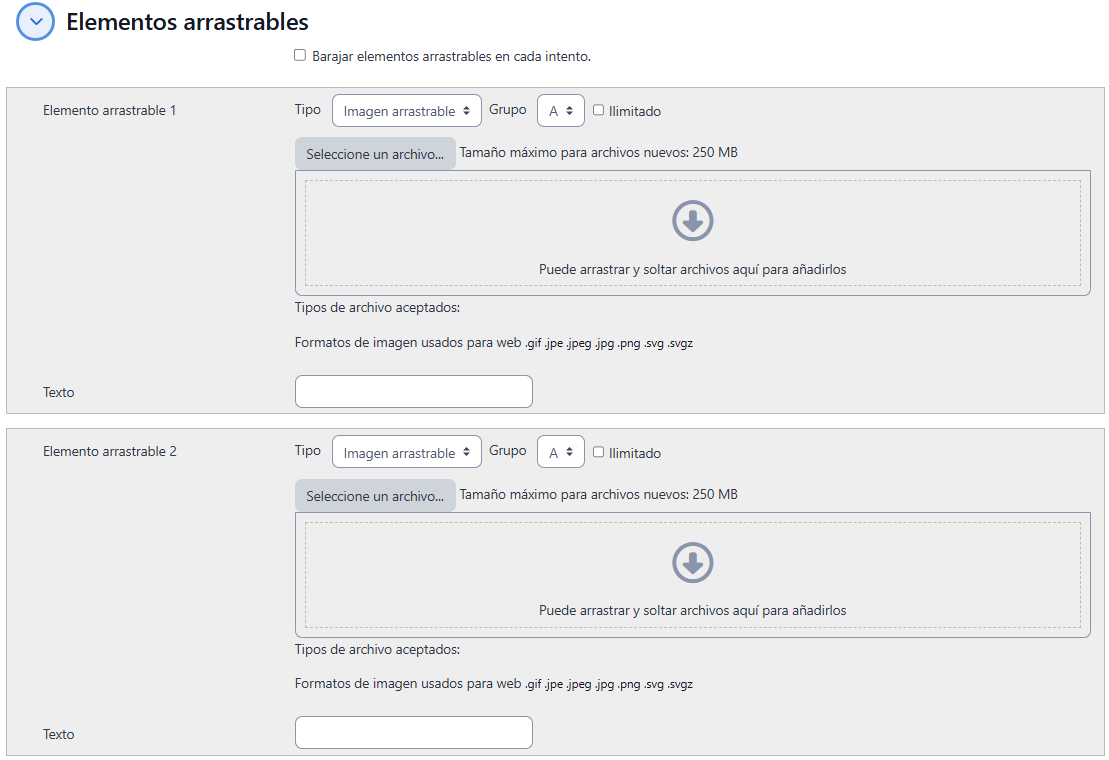 - En "Elementos arrastrables", si marca Barajar elementos arrastrables en cada intento., permite barajar las opciones cada vez que se realice un intento.