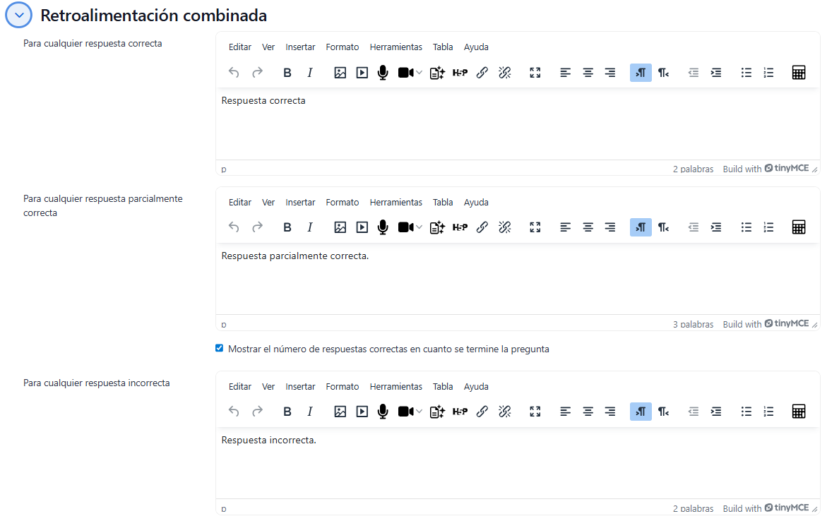Al elegir la opción "Se permitan varias respuestas", se puede establecer una retroalimentación en función del porcentaje de aciertos, para ello tenemos la opción "Retroalimentación combinada".
