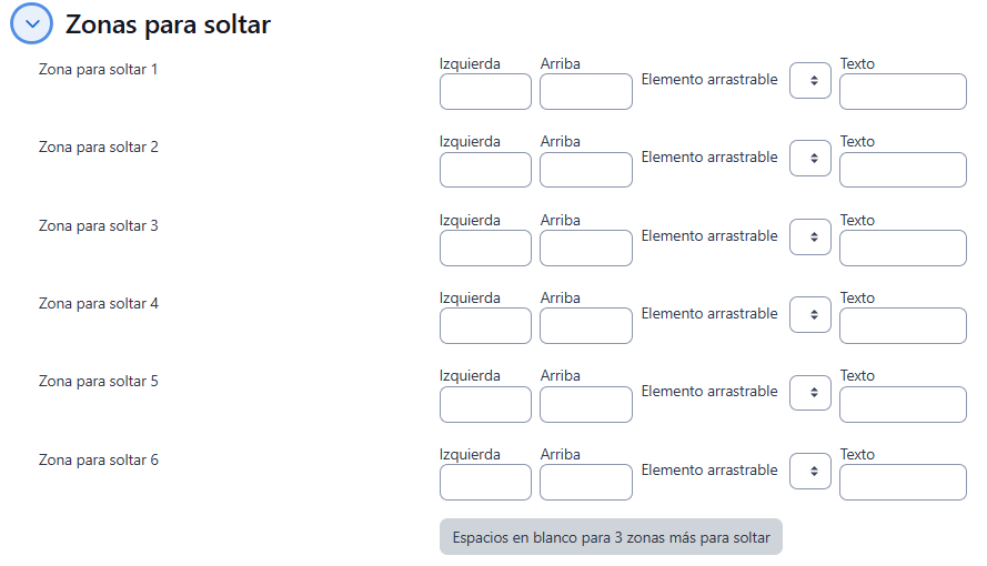 - Dentro de la sección Zona para soltar, seleccione en Elemento arrastrable el Texto o imagen que desea colocar en cada zona correcta, este elemento se ubicará en la esquina superior izquierda de la sección Vista Previa, de clic sobre el componente y proceda a arrastrarla hasta la ubicación deseada, una vez que lo suelte en las secciones "Zona para soltar 1,2…", en los campos Izquierda y Arriba, podrá visualizar automáticamente las coordenadas "x" e "y".