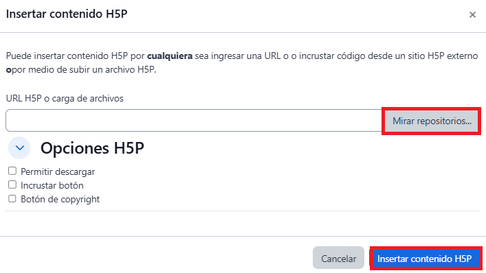 - De clic en el icono H5P del editor de texto y seleccione la opción Mirar repositorios.