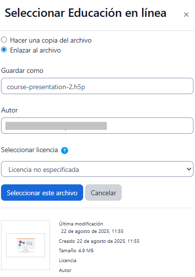 - En cada recurso H5P, se muestra información como: