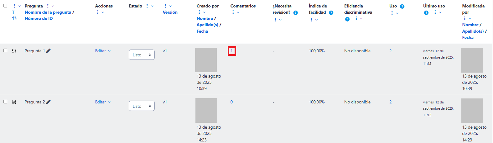 - Muestra cuántas veces la pregunta ha sido utilizada en cuestionarios del curso.