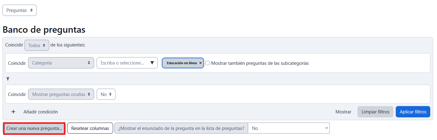 - Una vez dentro de la categoría deseada, hacer clic en el botón "Crear una nueva pregunta...".