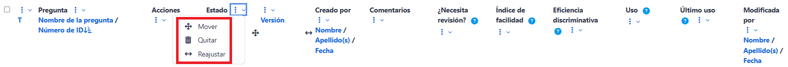 Al posicionarse en cualquiera de las columnas del Banco de preguntas y hacer clic en el icono de tres puntos, se muestran las siguientes acciones: