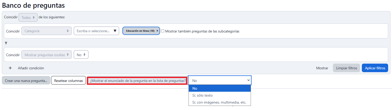 - "¿Mostrar el enunciado de la pregunta en la lista de preguntas?": Esta opción define cómo se visualizará el enunciado: