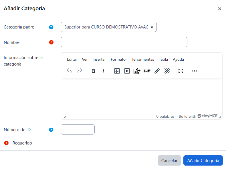 - "Información sobre la categoría", (opcional), Puede incluir una descripción interna, explicando el tipo de preguntas, el nivel de dificultad, o sugerencias de uso.