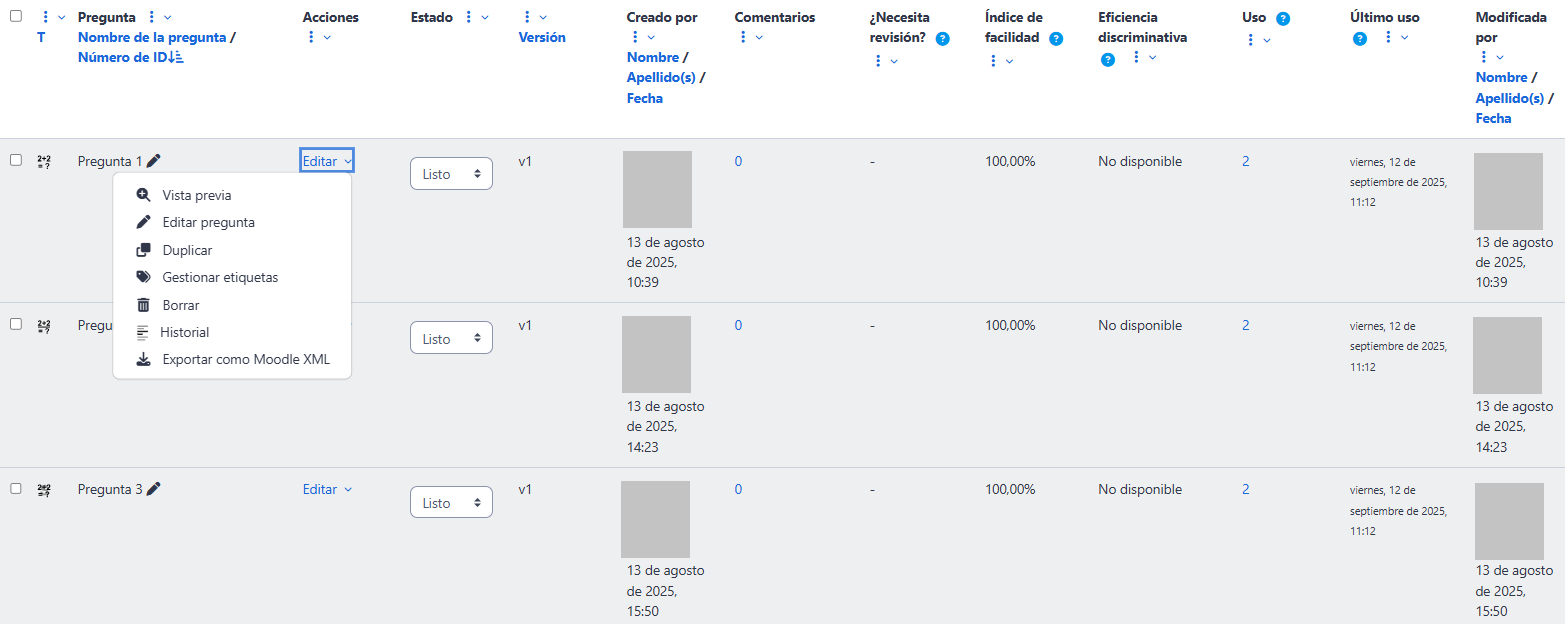 - "Editar pregunta": Abre el editor para modificar enunciado, respuestas, retroalimentación o configuraciones.