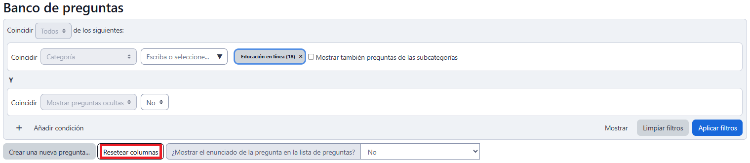 - Permite restablecer la tabla del Banco de preguntas a su configuración inicial.