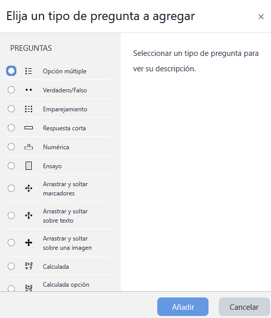 - Seleccionar el tipo de pregunta que desea crear ("Ejemplos:" Opción múltiple, Verdadero/Falso, Respuesta corta, Calculada, etc.).