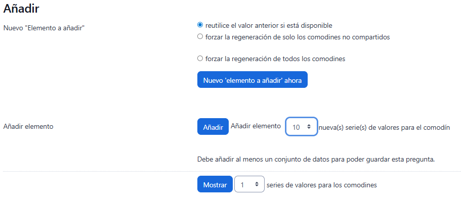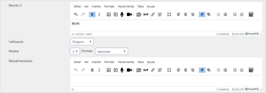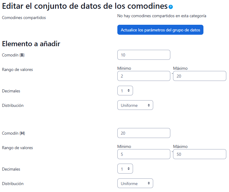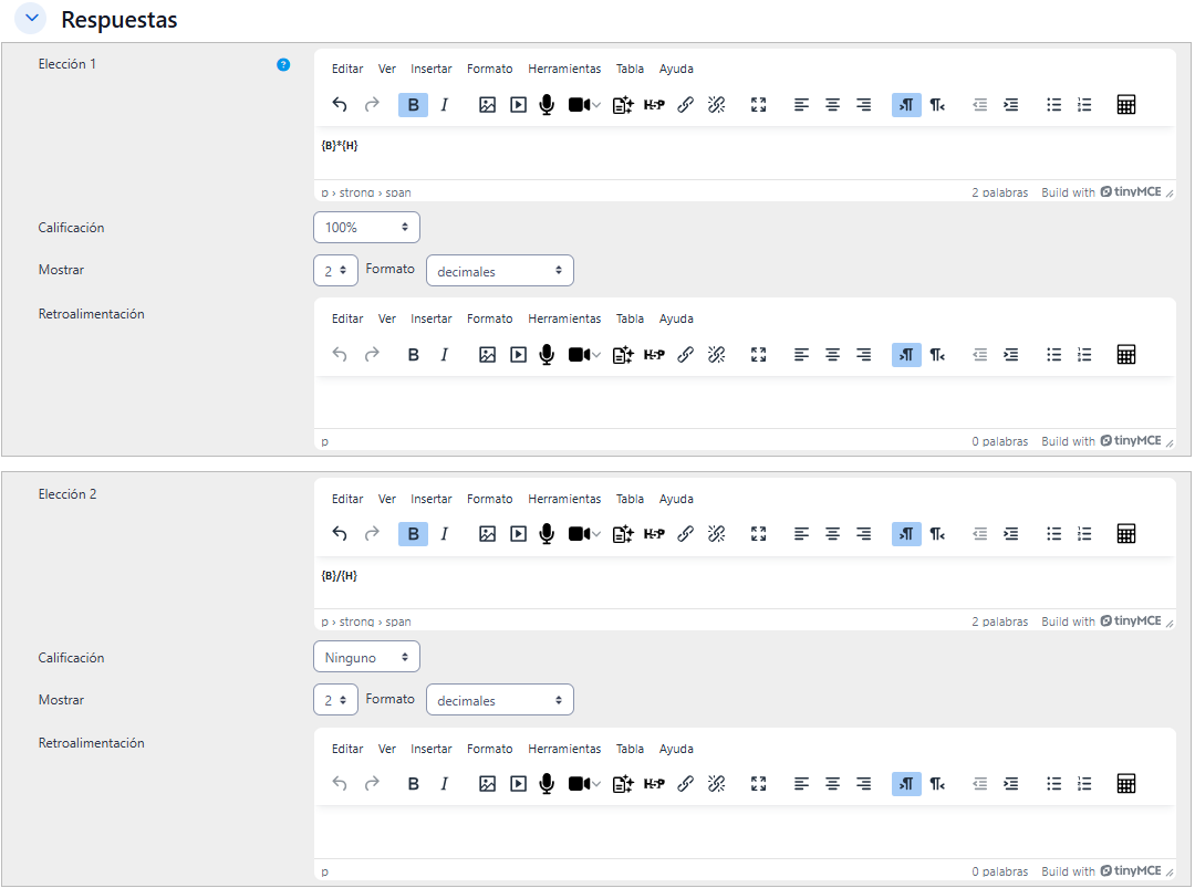 En esta sección se definen las fórmulas que generarán el conjunto de respuestas posibles, de las cuales al menos una debe ser correcta. Si se permite más de una respuesta correcta, en la columna Calificación se deben asignar porcentajes parciales cuya suma sea exactamente 100%.