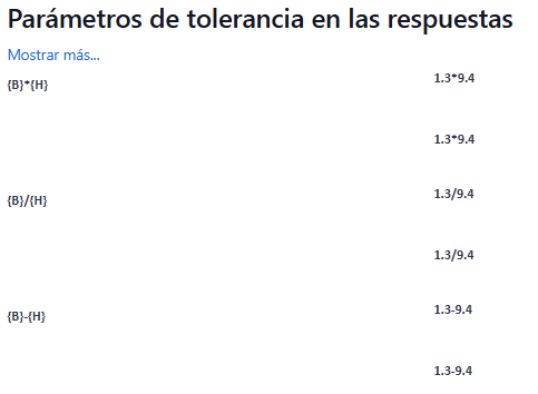 Parámetros de tolerancia en las respuestas, se detallan las operaciones de las respuestas ingresadas con las series de valores aleatorios generados, indicando el valor y el tipo de tolerancia considerado para darle como respuestas valida.