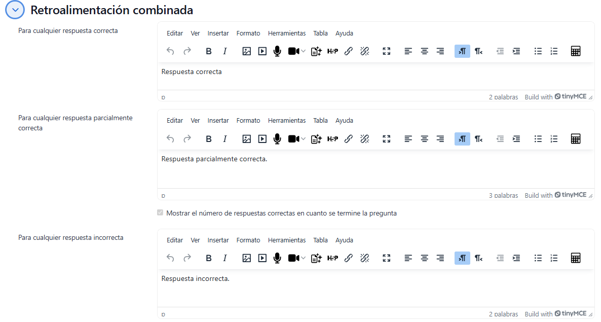 Al elegir la opción "Se permitan varias respuestas", se puede establecer una retroalimentación en función del porcentaje de aciertos, para ello tenemos la opción "Retroalimentación combinada".