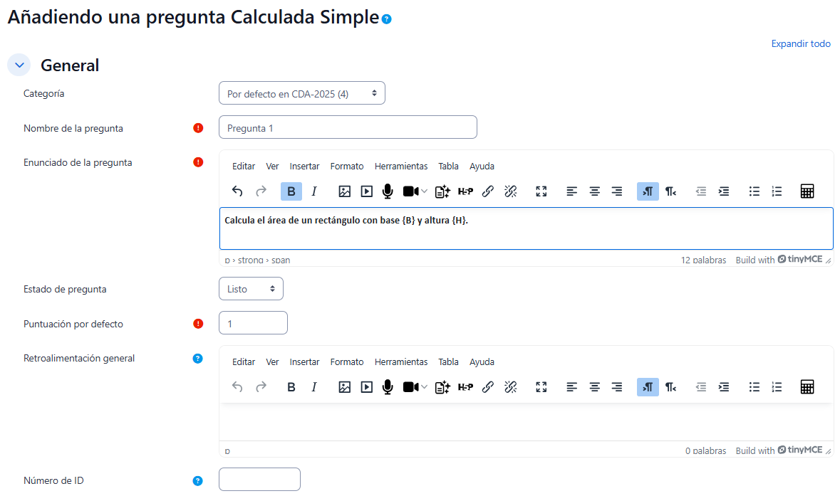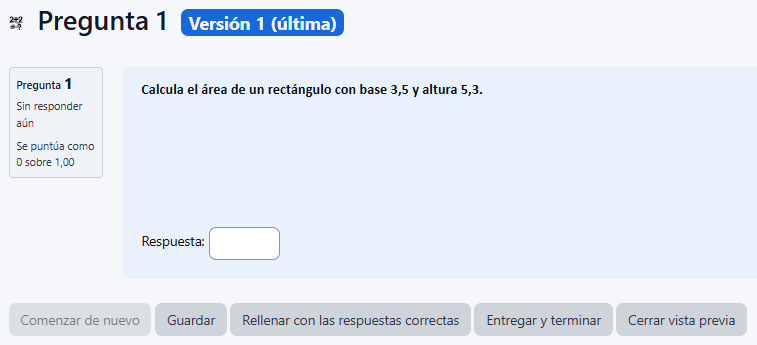 Este tipo de pregunta permite resolver ecuaciones matemáticas asignando valores a las variables, y toda su configuración se realiza en una única pantalla.