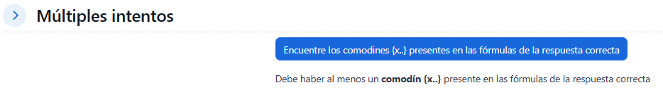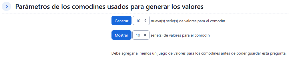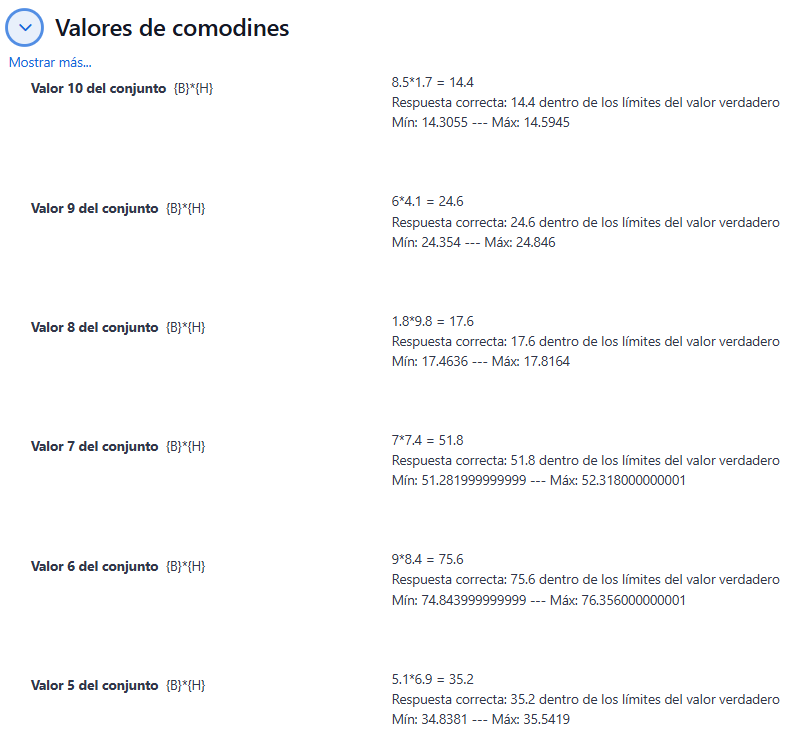 En este apartado pulse el botón Encuentre los comodines x… presente en las formulas de la respuesta correcta , se desplazará la sección Parámetros de los comodines usados para generar los valores.