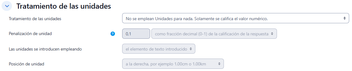 - En esta sección se decide si las unidades entran en la calificación de la pregunta en "Tratamiento de las unidades" y si se penaliza en caso de que sean incorrectas. Cuenta con 3 opciones: