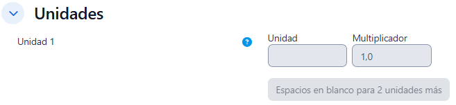 La opción Unidades permite establecer diferentes unidades de medida para la respuesta. En este bloque se configuran las unidades disponibles y el multiplicador, que es el factor por el cual se multiplica la respuesta numérica correcta.