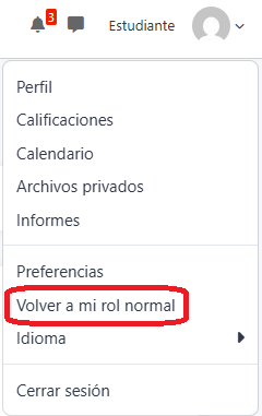 - Para volver a su rol original, diríjase nuevamente al menú de usuario (arriba a la derecha) y seleccione "Volver a mi rol normal".