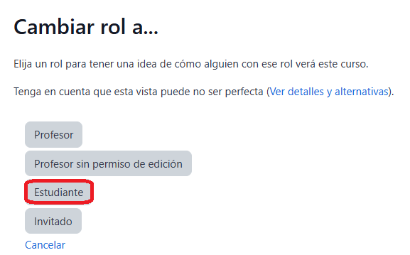 Nota: Utilice esta opción de manera frecuente para asegurarse de que las actividades, recursos y evaluaciones estén correctamente configurados y se visualicen adecuadamente para los estudiantes.