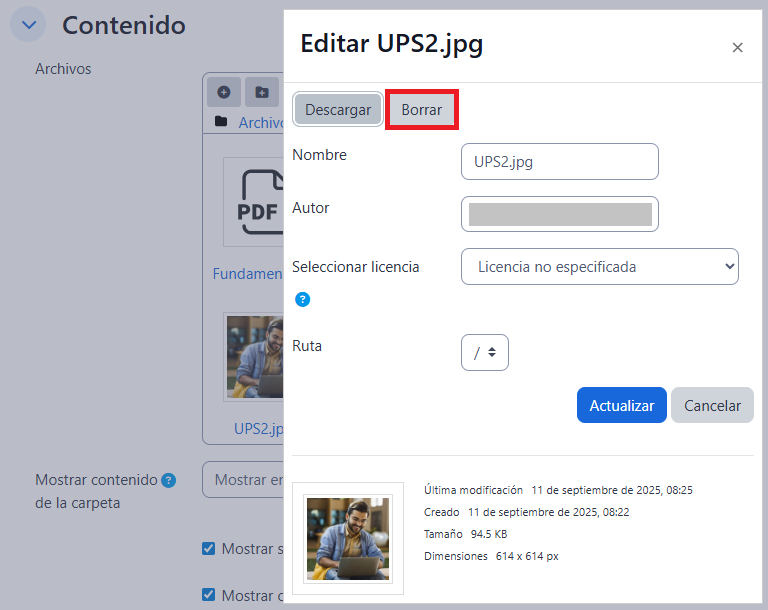 - En la sección Archivos de la carpeta, seleccione el archivo que desea eliminar y haga clic en el botón Borrar.