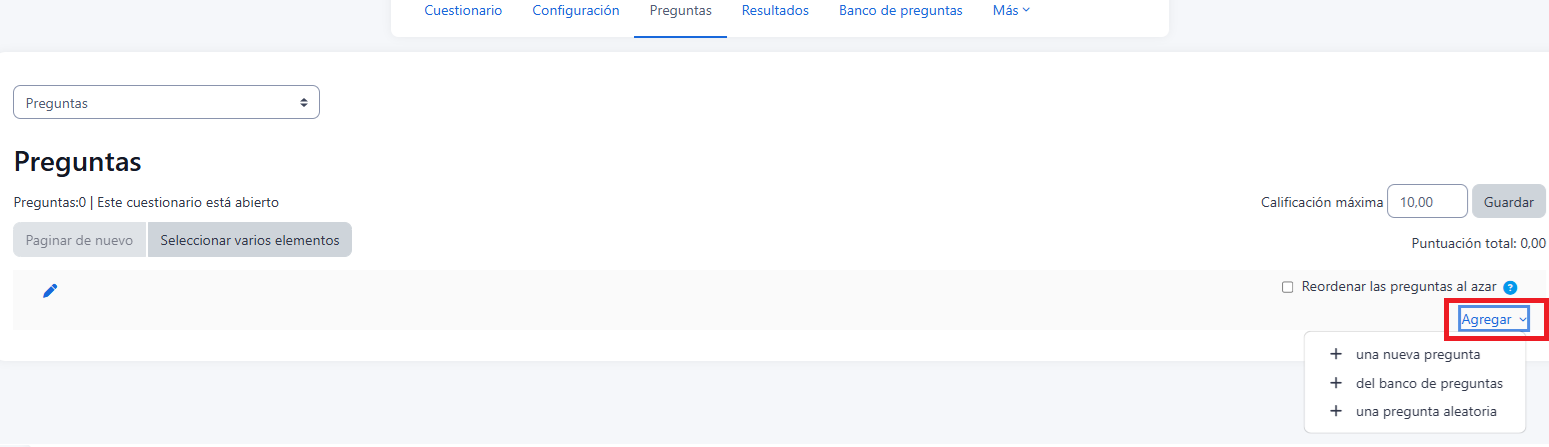 Se presenta la opción de agregar nuevas preguntas. Pulsando sobre "Agregar" se despliegan tres opciones para introducir preguntas al cuestionario.
