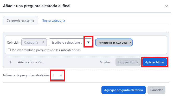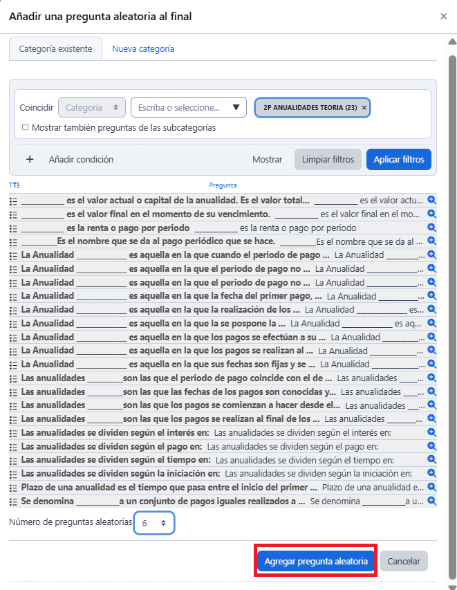 Permite incluir en el cuestionario preguntas al azar del Banco de preguntas previamente creado en el curso. También permite crear una categoría de la que se seleccionan el número de preguntas aleatorias que se desee en el cuestionario.