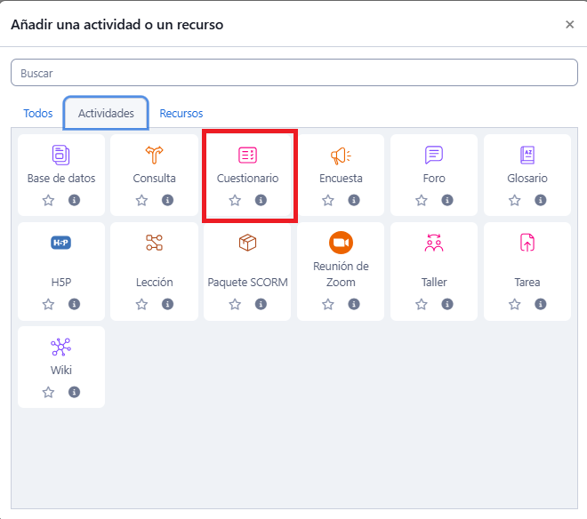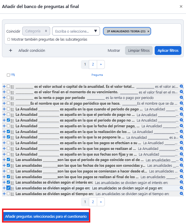 Luego de crear las preguntas en el Banco de preguntas, nos permite añadirlas en el cuestionario seleccionándolas del listado de preguntas existentes.