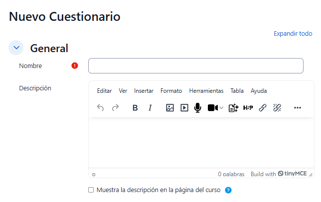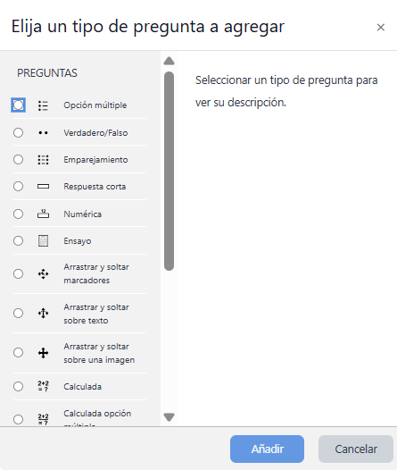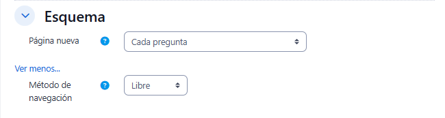 Según la opción que escojamos para agregar preguntas se visualizará en la ventana de configuración. En esta página disponemos de las siguientes opciones que se detallan a continuación: