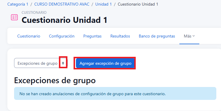 En el menú del cuestionario, en la opción Más --> “Excepciones”, se pueden configurar condiciones distintas, tales como fechas, tiempo o intentos, a las fijadas inicialmente mediante Excepciones de grupo y Excepciones de usuario.