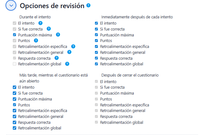 Estas opciones controlan la información que pueden ver los alumnos cuando realizan un intento. Puede proporcionarse: