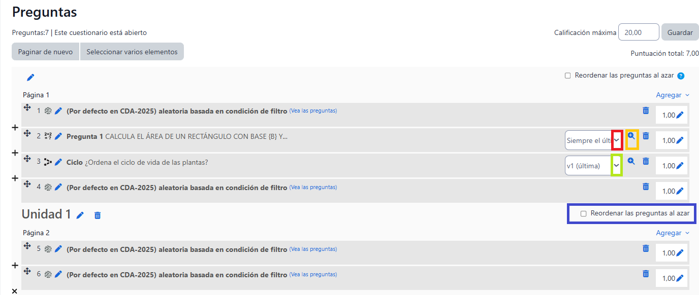 Volviendo a la configuración de la "Opción Preguntas", encontramos las siguientes opciones se visualizan en aquellas preguntas que fueron agregadas desde la opción Banco de preguntas.