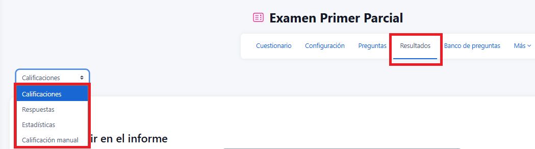 Cuando el rol estudiante realiza un cuestionario, se dispone de información sobre los intentos efectuados. Esta información la localizamos al acceder, en Resultados del menú de la actividad o en Intentos: N, se ven el número de veces que fue resuelta la actividad. También, se visualiza la calificación obtenida en cada pregunta y en total, la fecha de realización y la cantidad de tiempo invertido entre otros datos.