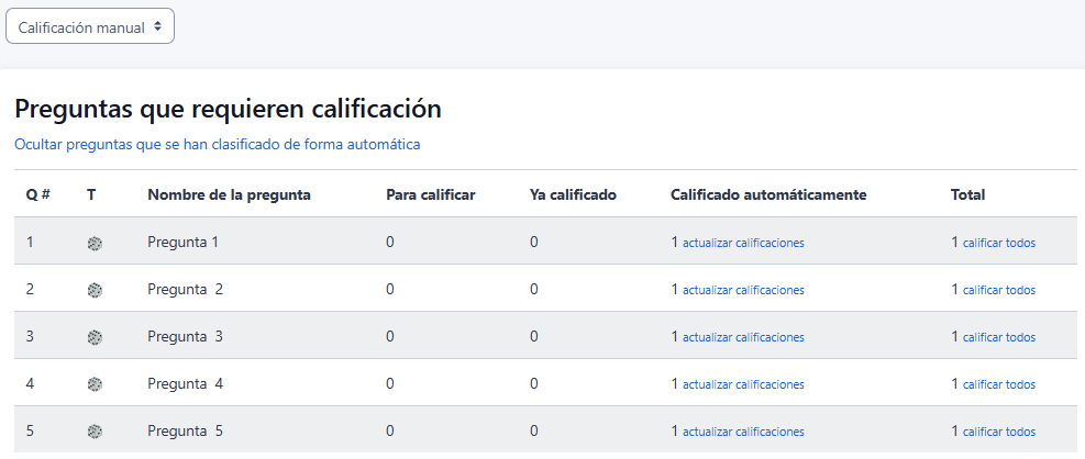 Al seleccionar la opción de Calificación manual, se mostrará un listado de las preguntas que requieren calificación.
