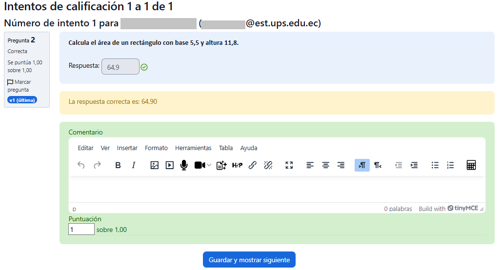"Calificación manual". Permite calificar las preguntas de tipo ensayo y también cambiar la calificación recibida automáticamente en el resto de las preguntas en el cuestionario.