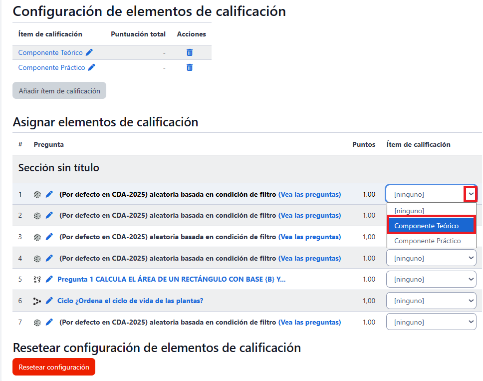 Al final encontramos un botón en rojo que nos indica "Resetear configuración". Esto borrará todos los elementos de calificación y desasignará preguntas y secciones.
