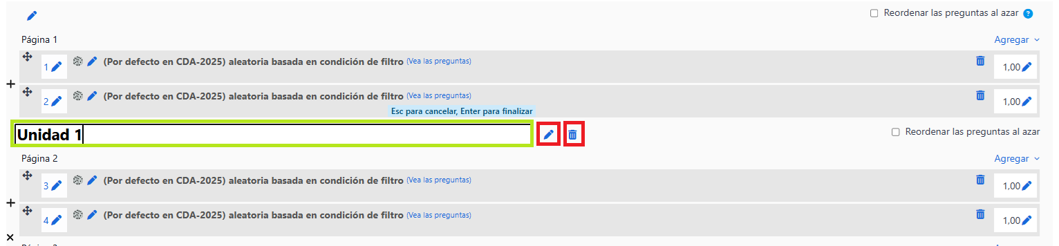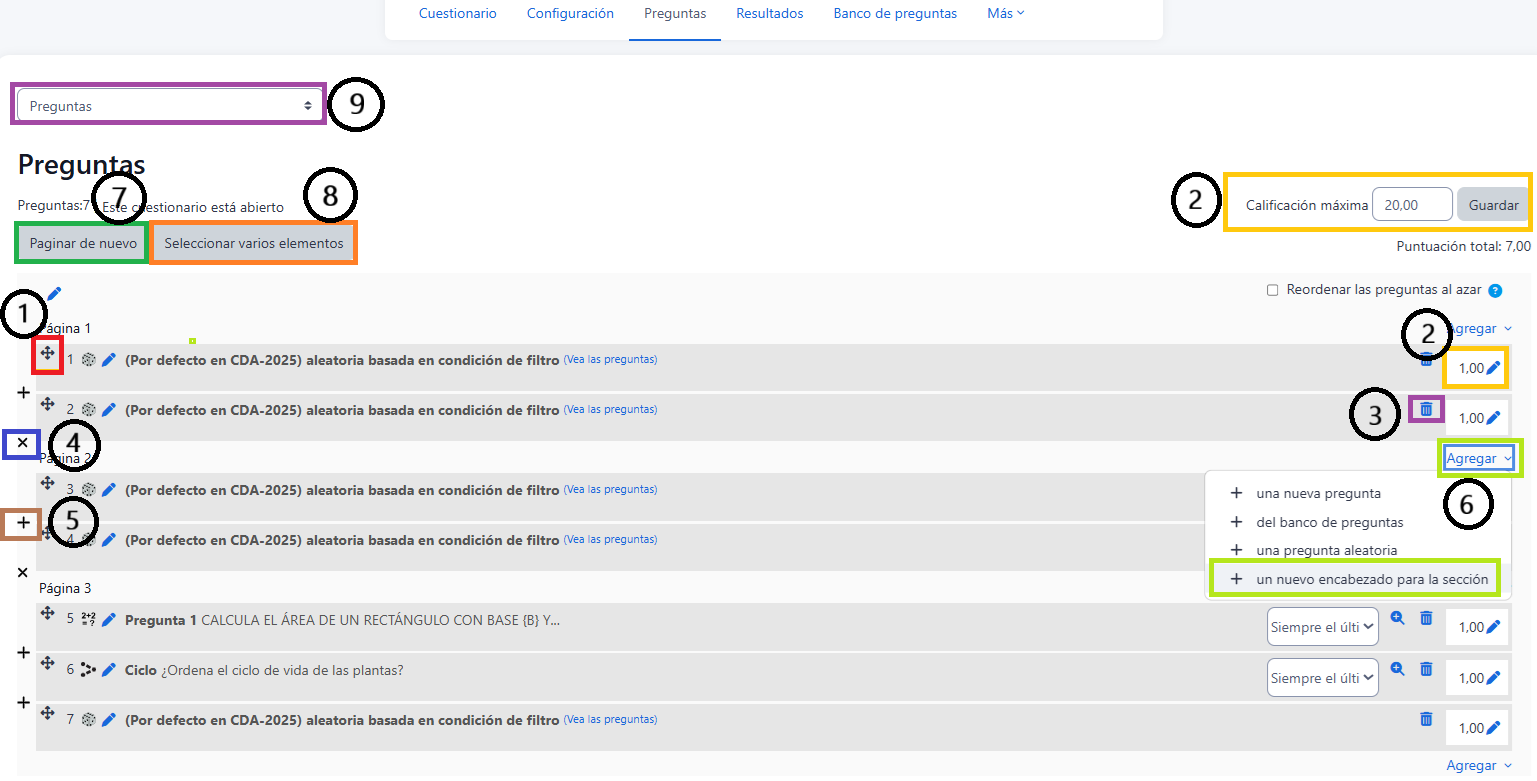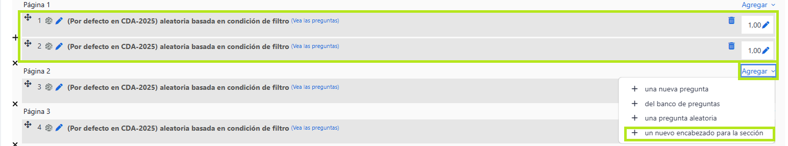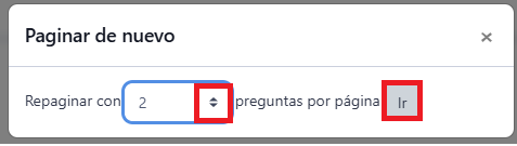 Al hacer clic en el botón "Paginar de nuevo", se borrará la organización actual de las preguntas en páginas, lo que te permitirá redefinir cuántas preguntas se muestran por página.