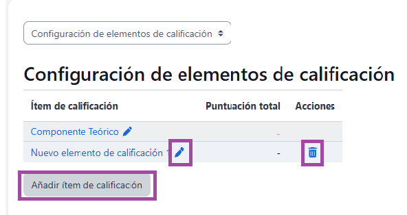 Desplegamos la opción "Preguntas" y hacemos clic en la opción "Configuración de elementos de calificación".