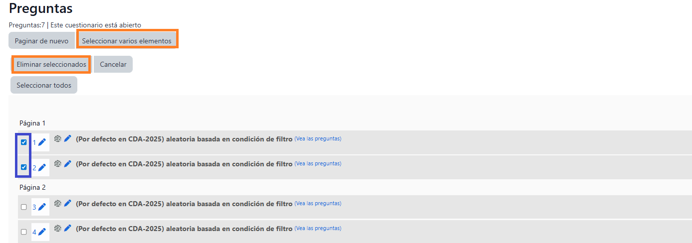 Al hacer clic en el botón "Seleccionar varios elementos", nos permite seleccionar por preguntas y eliminar las preguntas seleccionadas o mediante la opción del botón "Seleccionar todos", escoger todas las preguntas y de forma masiva podemos eliminar.