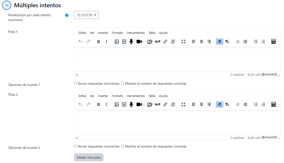 - En Múltiples intentos, existe el campo Penalización por cada intento incorrecto donde se define el valor de penalización, así como sus respectivas pistas aplicadas por cada intento incorrecto al momento de resolver el cuestionario