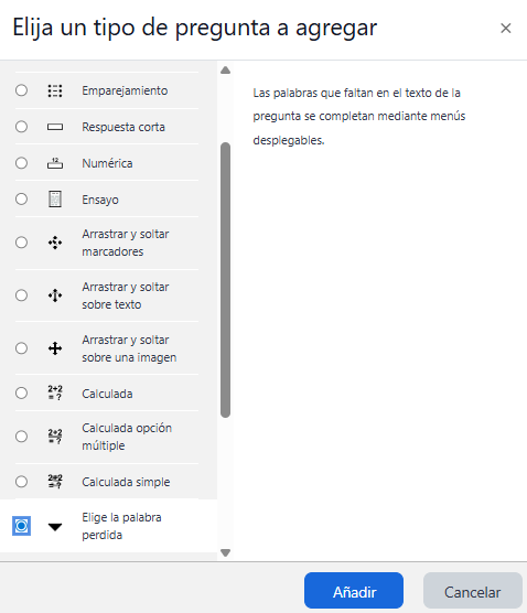 - Seleccionar "Elige la palabra perdida" y luego hacer clic en el botón "Añadir"