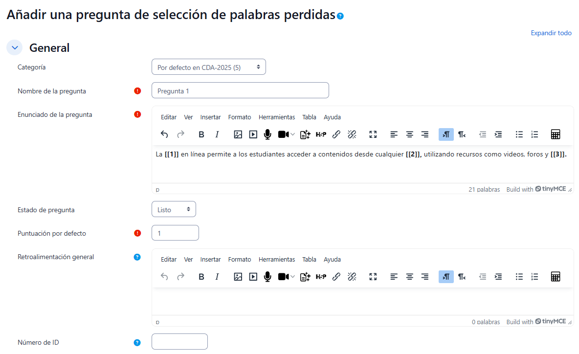 - Escriba el "Enunciado de la pregunta", teniendo en cuenta que hay que escribir[[1]], [[2]], [[3]]… en el espacio que desea que vaya la respuesta.