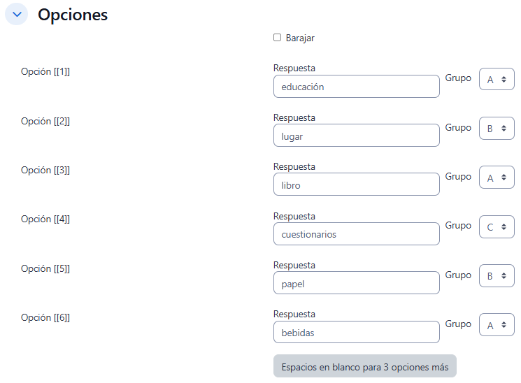 - Al marcar la casilla "Barajar", se indica que las opciones se barajen.