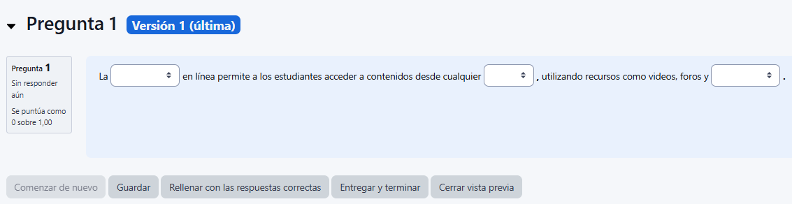 Pregunta que tiene textos faltantes, los cuales se visualizan con un menú desplegable para elegir la opción correcta.