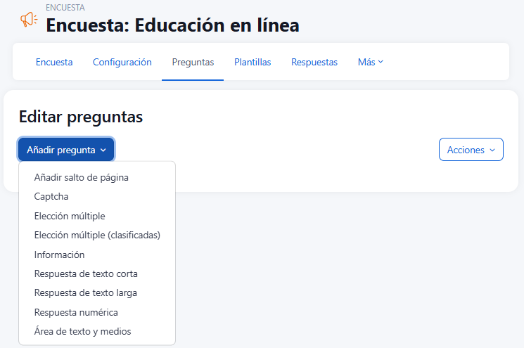- "Información": Muestra texto o instrucciones sin esperar respuesta. Es útil para guiar a los estudiantes dentro de la encuesta.