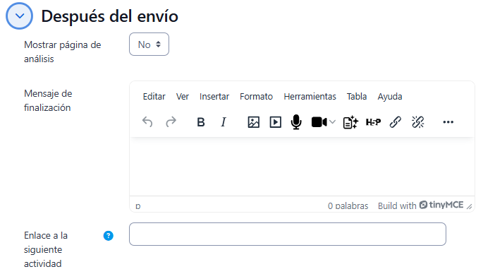 "Enlace a la siguiente actividad": Opción que dirige automáticamente al participante hacia otra actividad o recurso del curso una vez completada la encuesta, facilitando la continuidad del aprendizaje.