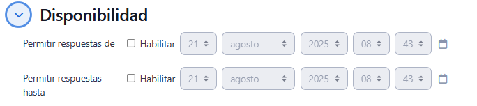 - La actividad Encuesta puede habilitarse dentro de un periodo específico. Para ello, se deben marcar las casillas "Permitir respuestas de" y "Permitir respuestas hasta", seleccionando las fechas correspondientes."