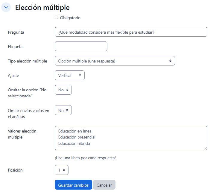 - "Valores elección múltiple”": Lista de opciones, una por línea, tal como se mostrarán al estudiante.