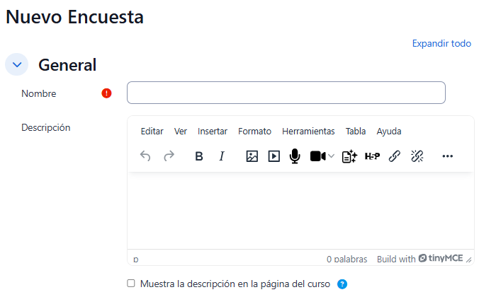 - Puede marcar la casilla "Mostrar la descripción en la página del curso" si desea que se vea junto al nombre.