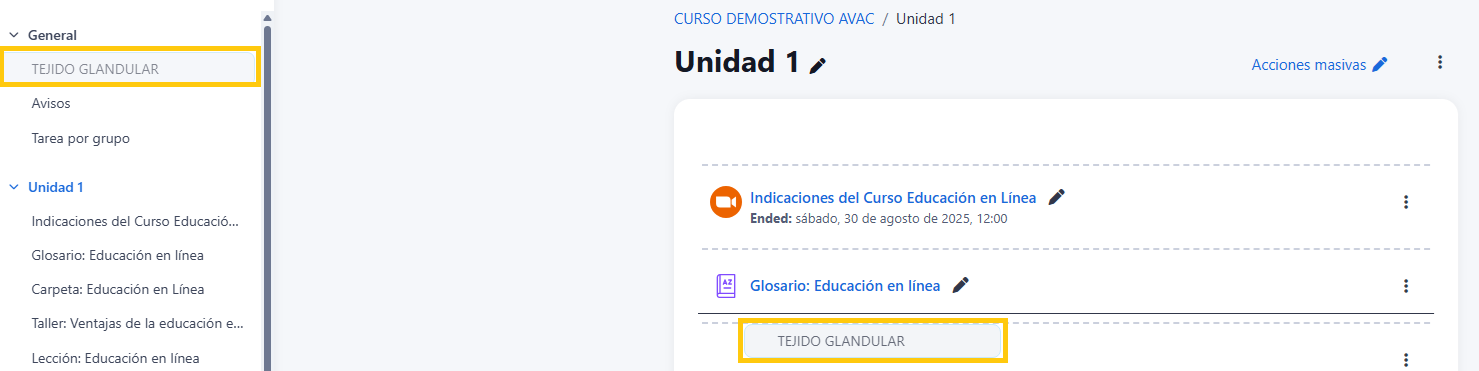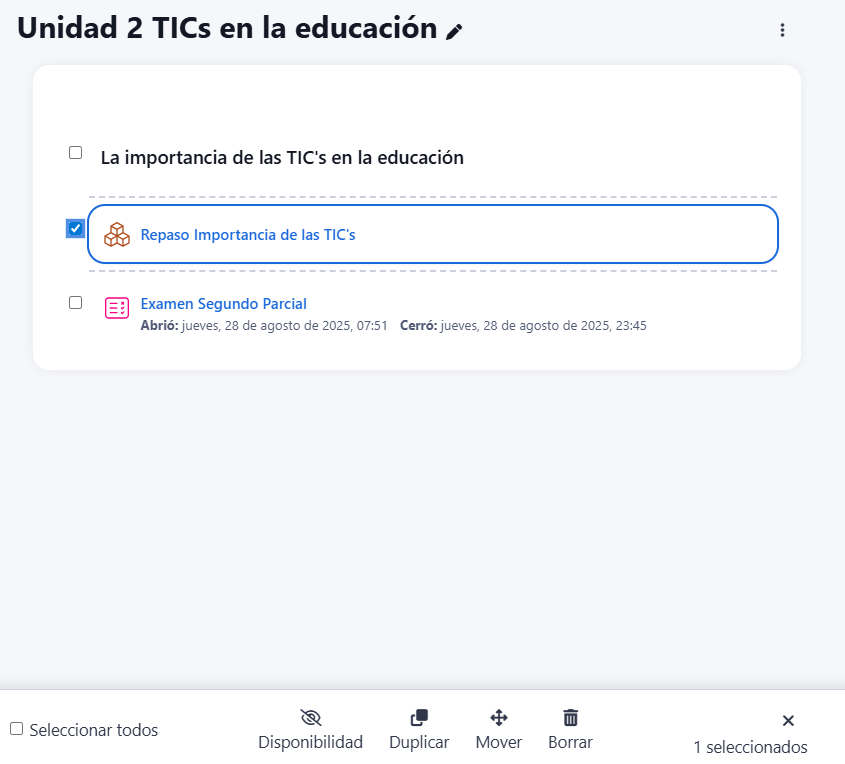 Segundo, el docente marca las casillas que se habilitan a la izquierda de recursos, actividades y secciones creadas por el docente.