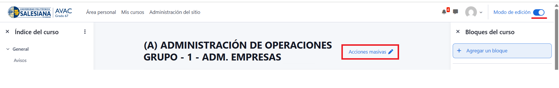 Primero, luego de tener activado el modo edición debe dirigirse a la opción "Acciones masivas".